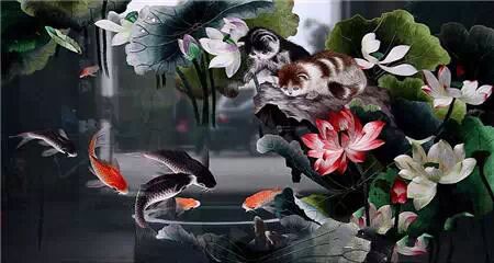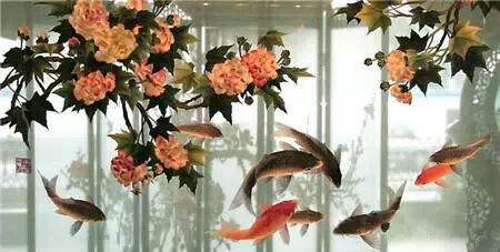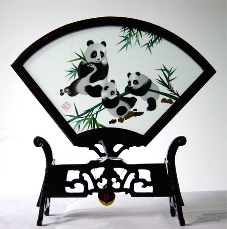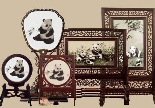 ▌蜀绣 蜀绣以软缎、彩丝为主要原料,其绣刺技法甚为独特,至少有100种以上精巧的针法绣技,如五彩缤纷的衣锦纹满绣、绣画合一的线条绣、精巧细腻的双面绣和晕针、纱针、点针、覆盖针等都是十分独特而精湛的技法。当今绣品中,既有巨幅条屏,也有袖珍小件;既有高精欣赏名品,也有普通日用消费品。比如北京人民大会堂四川厅的巨幅“芙蓉鲤鱼”座屏和蜀绣名品“蜀宫乐女演乐图”挂屏、双面异色的“水草鲤鱼”座屏、“大小熊猫”座屏,就是蜀绣中的代表作。