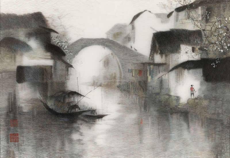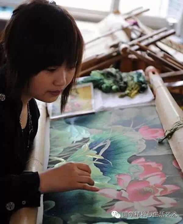 ▌苏绣 苏绣的历史长达2000多年。苏绣自古便以精细素雅著称于世,其构图简练,主题突出,技巧精湛。仅以苏绣所用最细的线以为一般人的肉眼所能看清楚为例,足见其精细之极。绣技具有“平、齐、和、光、顺、匀”的特点。“平”指绣面平展;“齐”指图案边缘齐整;“细”指用针细巧,绣线精细;“密”指线条排列紧凑,不露针迹;“和”指设色适宜;“光”指光彩夺目,色泽鲜明;“顺”指丝理圆转自如;“匀”指线条精细均匀,疏密一致。在种类上,苏绣作品主要可分为零剪、戏衣、挂屏三大类,装饰性与实用性兼备。其中以“双面绣”作品最为精美。