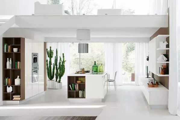 这个设计案例,通过嵌入式的设计,将厨房家电“藏”起来。翠绿的仙人掌和随处可见的书柜,让你忘记这是一个厨房。