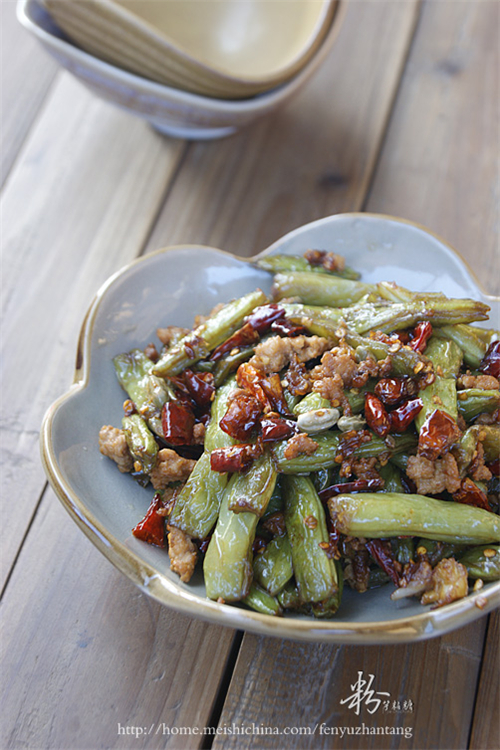 做法 1.肉剁成末,干红辣椒洗净灰尘,擦干水分剪成小段,蒜剁成茸备好; 2.四季豆两头去筋,洗净后掰成5-6cm长段,用厨房纸吸干表面水份; 3.炸锅置火上,倒入香油大火烧至五成热时,放入四季豆,改成中火慢慢煸至表面变白,外皮开始出现皱褶时,捞出沥干油备用; 4.炒锅下油烧热,爆香蒜和干红辣椒; 5.放入肉末,用铲子快速将肉末划散,调入料酒和盐,把水份翻炒煸干; 6.倒入炸过的四季豆,调入生抽、鸡精、盐、糖、花椒粉翻炒; 7.炒匀入味后煸干水份出锅装盘。 小窍门 1.加入糖有提鲜的作用。