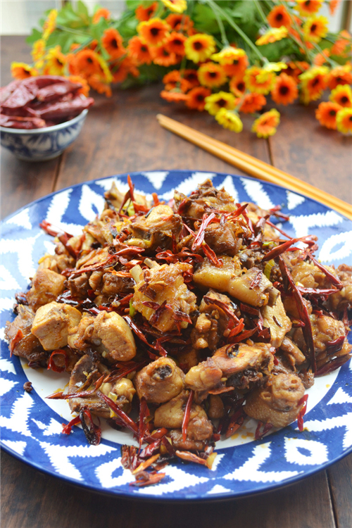 主料 嫩仔鸡750克 调料 干辣子丝80克、花椒50粒、料酒10克、葱姜蒜各20克、老抽生抽适量、味精3克、白糖适量、盐适量 做法 1.花椒用清水洗净,葱姜蒜切粒; 2.鸡洗净剁成2厘米见方的块,倒入料酒,放入老抽、生抽各半汤匙,放盐,搅拌腌制10分钟; 3.坐锅入油,烧至7、8成热放入鸡块,用中大火炸制,鸡块炸至将熟,水分将干时捞出沥油; 4.另起一锅置火上,入油,烧热后放入干辣子、花椒粒,用中小火煸出香味; 5.投入葱姜蒜,倒入鸡块,放入适量盐和糖炒匀; 6.放入味精,炒匀,装盘。 小窍门 1.选料应选新鲜嫩鸡。 |