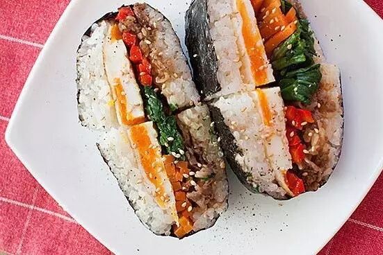 步骤: 1.把海苔平铺在保鲜膜上; 2.铺一层米饭,放上你喜欢的馅料; 3.再放一层米饭; 4.借助保鲜膜用海苔包裹住饭团; 5.用刀将饭团对切,去掉保鲜膜,完成。 饭团的馅料,大家就按自己喜欢的来,蔬菜、水果、蛋类、肉类都可以。米饭可以用之前的剩饭,或者在前一天晚上做好。